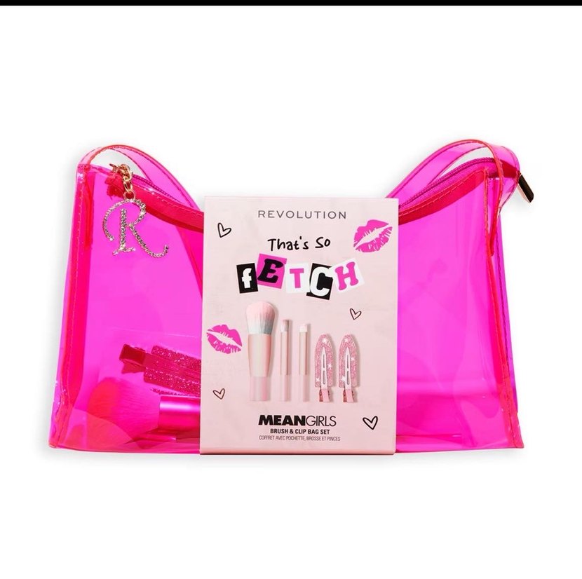 Parlak pembe çanta, Mean Girls temalı baskılı pop kültür grafiklerine sahip, 'REVOLUTION' ve 'GETCH' yazıları içerir.