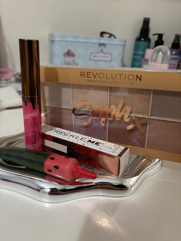 revolution highlighter paleti birkaç kez swatchlandı✨️✨️ revolution çil kalemi hic kullanılmadı kutusuyla duruyor revolution pembe gloss iki kez kullanıldı watermelon kırmızı allık içinde az bulunuyor