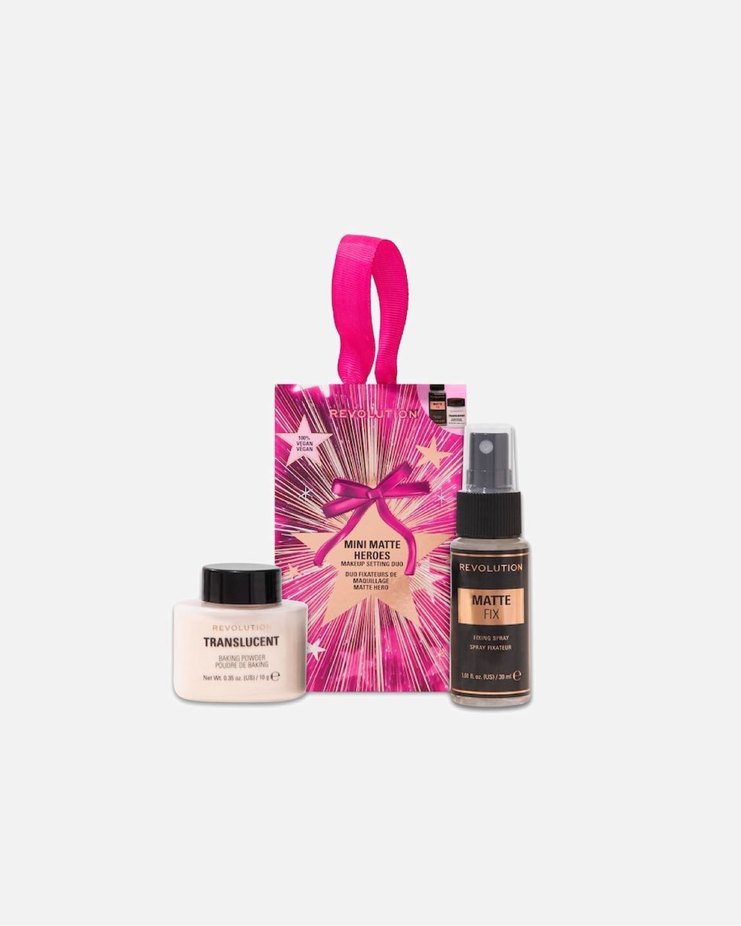 Revolution markasının açık pembe transparan pudrası ve mat bitişli sabitleyici spreyi içeren set. Makyajınızın kalıcılığını artırır ve parlaklığı azaltır. Hediye almıştım kaldı öyle pudrası bile baya yeter ben kullanıyorum normalde