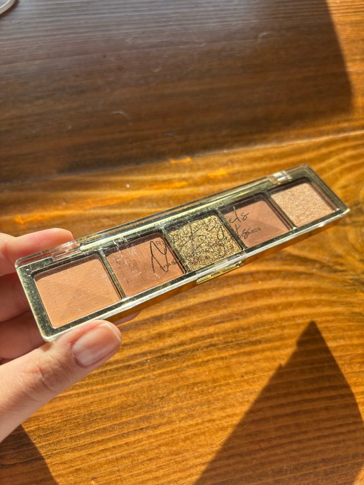 Bej ve açık kahverengi tonlarında, parıltılı altın rengi dahil beş renk göz farı paleti. Doğal makyajlar için uygun. ✨