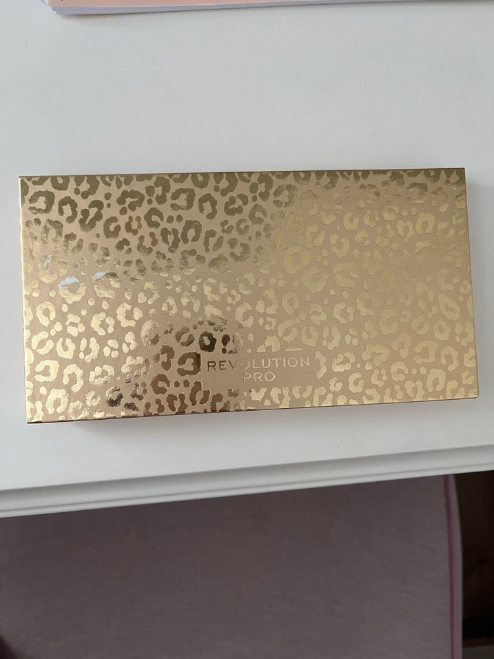 Revolution Pro markalı bu altın renkli göz farı paleti, parlak leopar desenli kapakla dikkat çekiyor. Canlı renk seçenekleri sunar. ✨