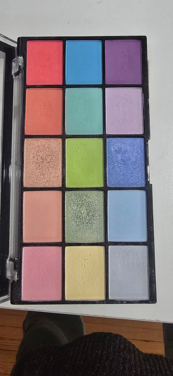 Canlı ve açık tonlarda mat ve parlak bitişli çoklu renklerden oluşan far paleti. 2 kez kullandım. Fiyat sondur.