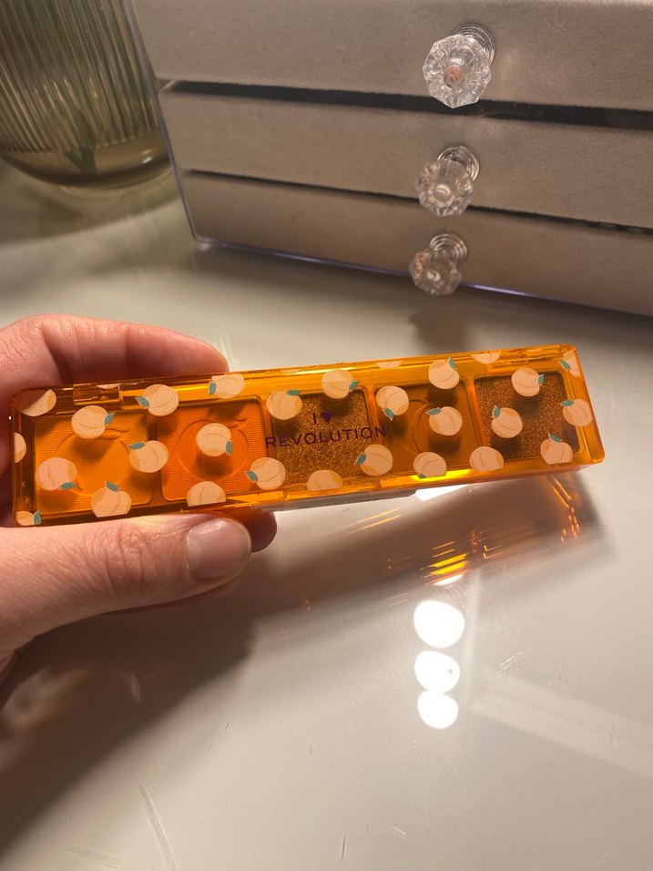Turuncu renkli ve parlak yüzeye sahip Revolution markalı eyeshadow paleti, noktalı deseniyle dikkat çekiyor.