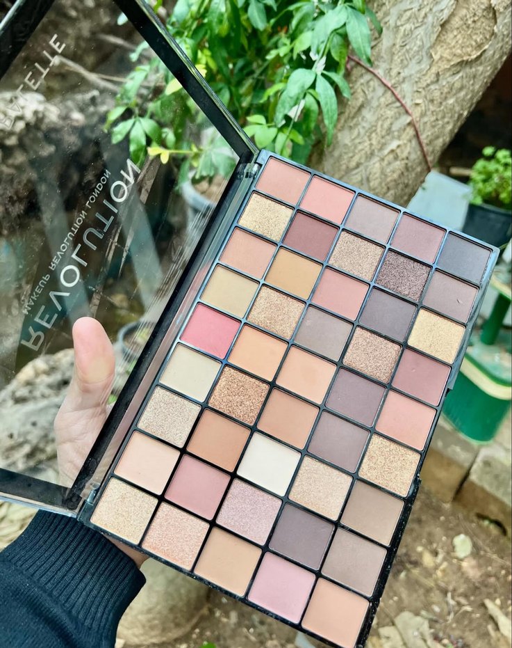 Mat ve simli bitişlere sahip bej ve açık tonlarda çeşitli göz farları içeren palet. Doğal makyaj için uygun nötr renkler sunar.