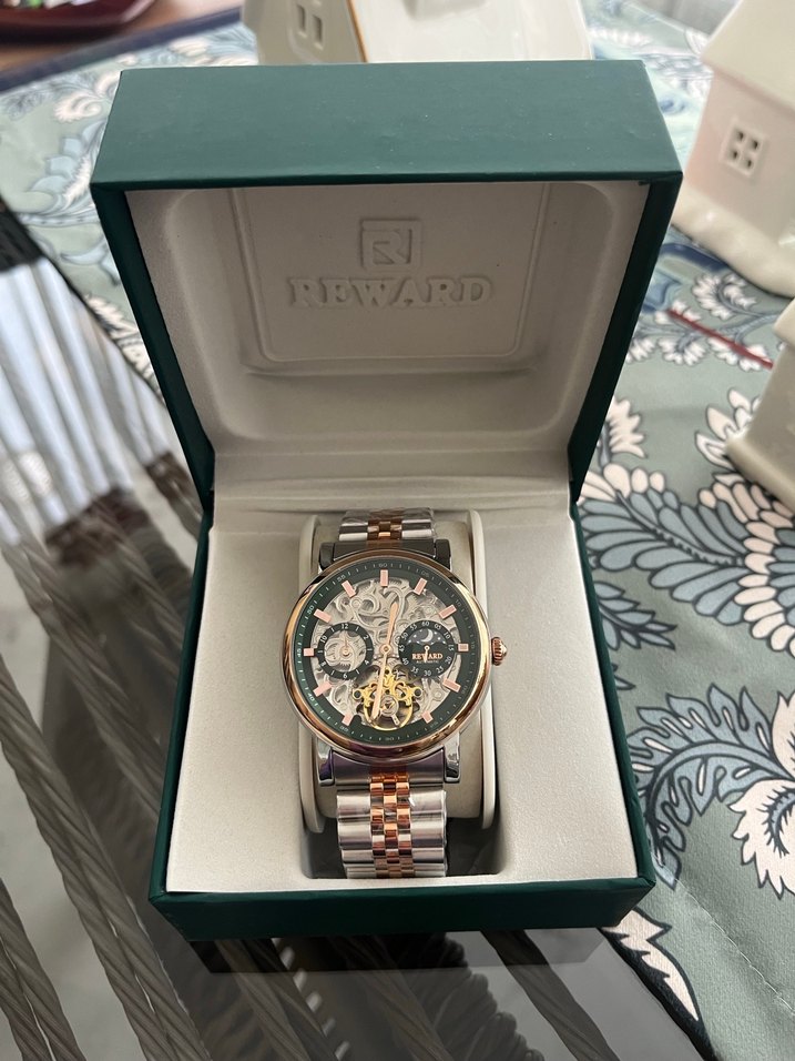 Reward markalı erkek saati, altın renkli çerçeve ve iki renkli metal bilezikle modern klasik tasarımı bir araya getiriyor. Çoklu alt kadranlar bulunur. ⌚ Orijinal ve 2 yıl garantilidir.