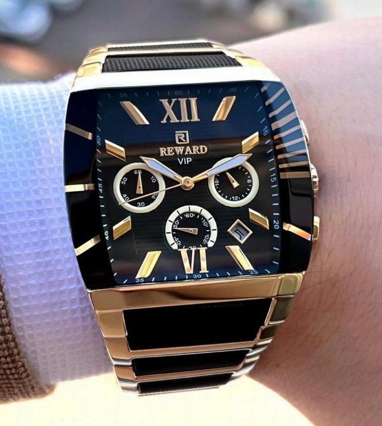 Erkekler için koyu altın tonlu, çağdaş tasarımlı saat. Dikdörtgen kadran, Roma rakamları XII ve VI, üç alt kadran ve tarih göstergesi bulunur. Altın ve siyah detaylı bileklik şık görünür. ⌚