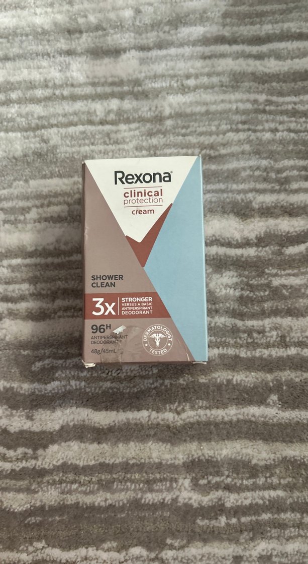Rexona Clinical Protection duş temizliği kokusuyla 96 saat koruma sağlar, 3 kat daha güçlü formüle sahiptir, dermatolojik olarak test edilmiştir. Kutusu sadece biraz ezilmiştir ama hiç kullanılmamıştır