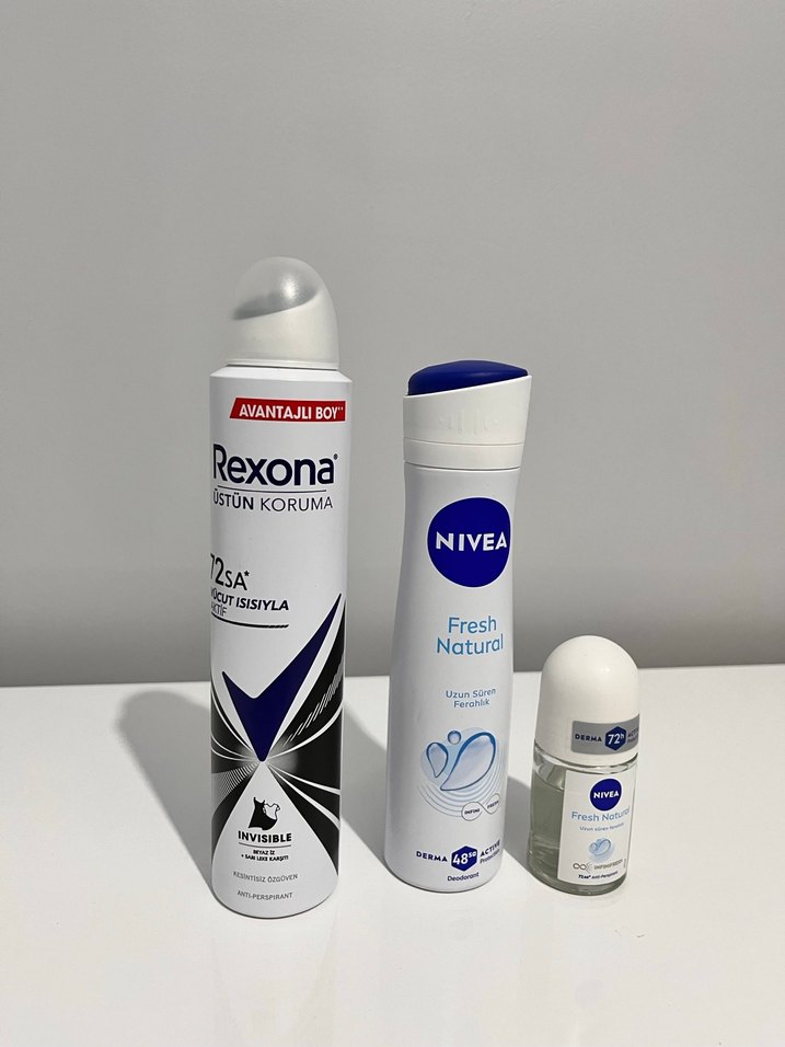 Rexona uzun süre koruma sağlayan sprey deodorant ve Nivea Fresh Natural sprey ile roll-on deodorantlardan oluşan taze koku ve 48 saat koruma seti. az kullanılmıştır