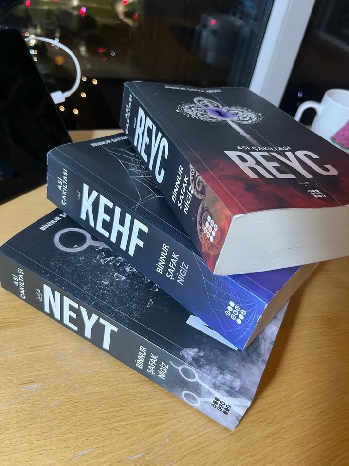Büşra Şafak Nigiz'in Reyc, Kehf ve Neyt adlı üç romanını içeren set. Her kitabın ayrı kapak tasarımı vardır.