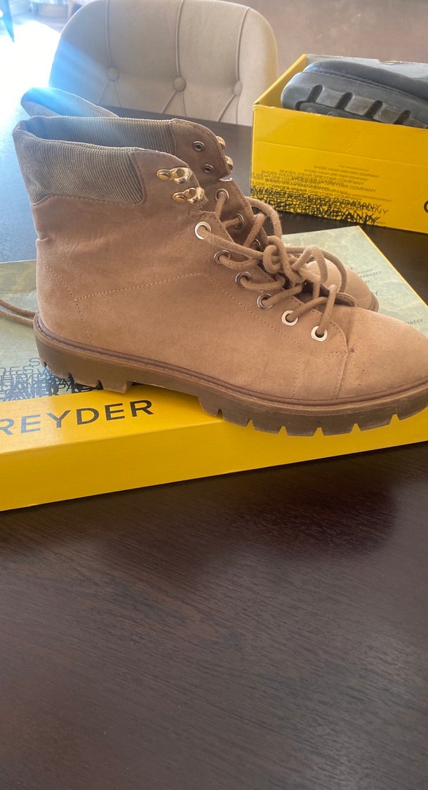 Reyder markalı, kahverengi süet malzemeden yapılmış, topuklu ve tokalı kadın botları, rahat ve şık bir günlük kullanım sunar.