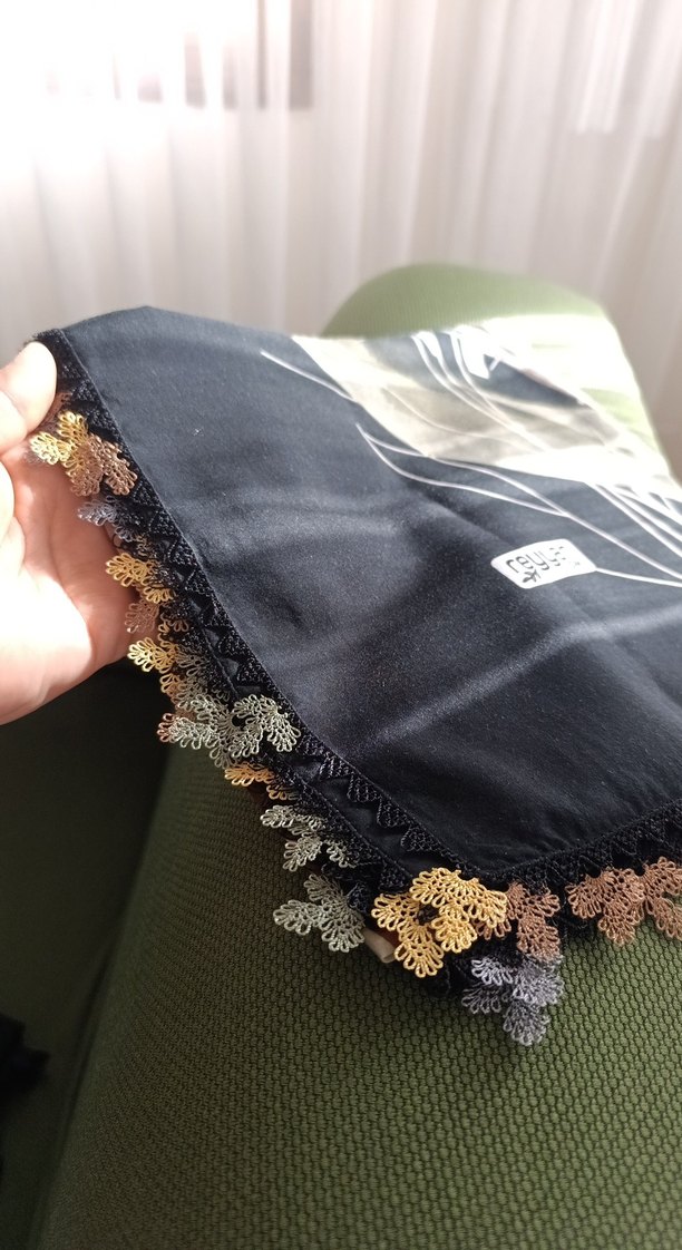 Yumuşak tekstil kumaştan, çok renkli dantel kenar detaylı siyah bohem kadın fular. Moda ve avangart tarzı yansıtır.