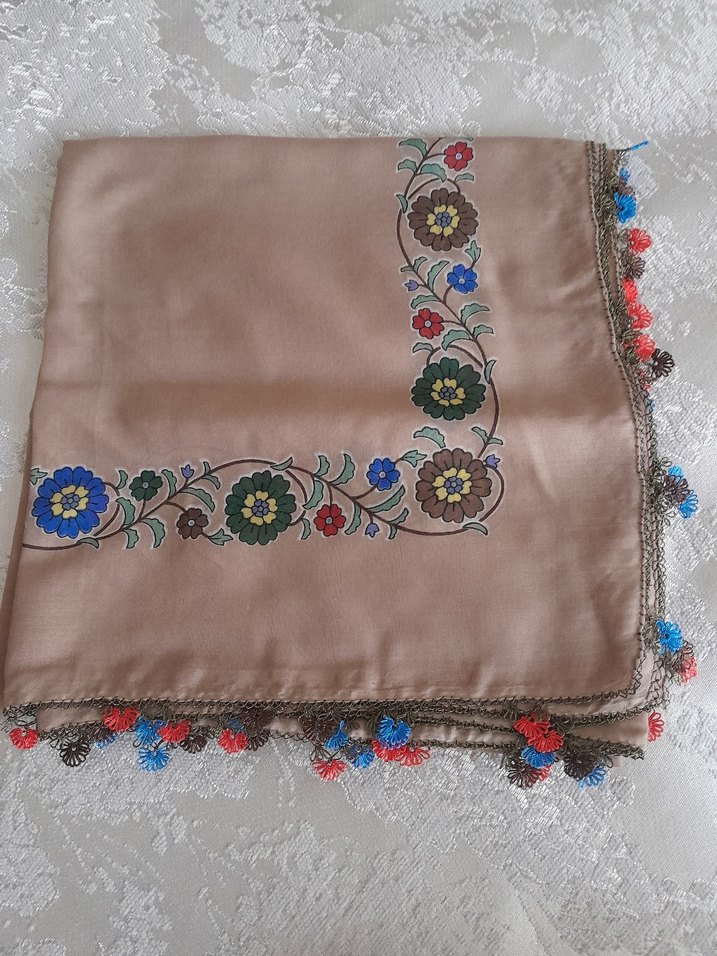 reyyan igne oyali yazma Bej renkli, renkli çiçek işlemeli ve dantel kenarlı kadın fuları. Yumuşak tekstil kumaştan, bohem tarz için uygun.