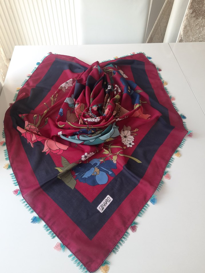 Reyyan iğne oyası Bordo renkli, çiçek desenli ve püsküllü bu tekstil fular, bohem tarzı yansıtır. Retro ve hippie tarzı sevenlere uygundur.