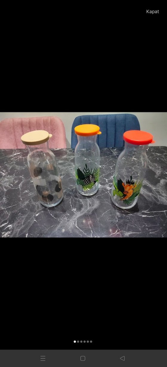 Üçlü renkli bebek şişesi seti, farklı renk kapaklar ve eğlenceli desenlerle.