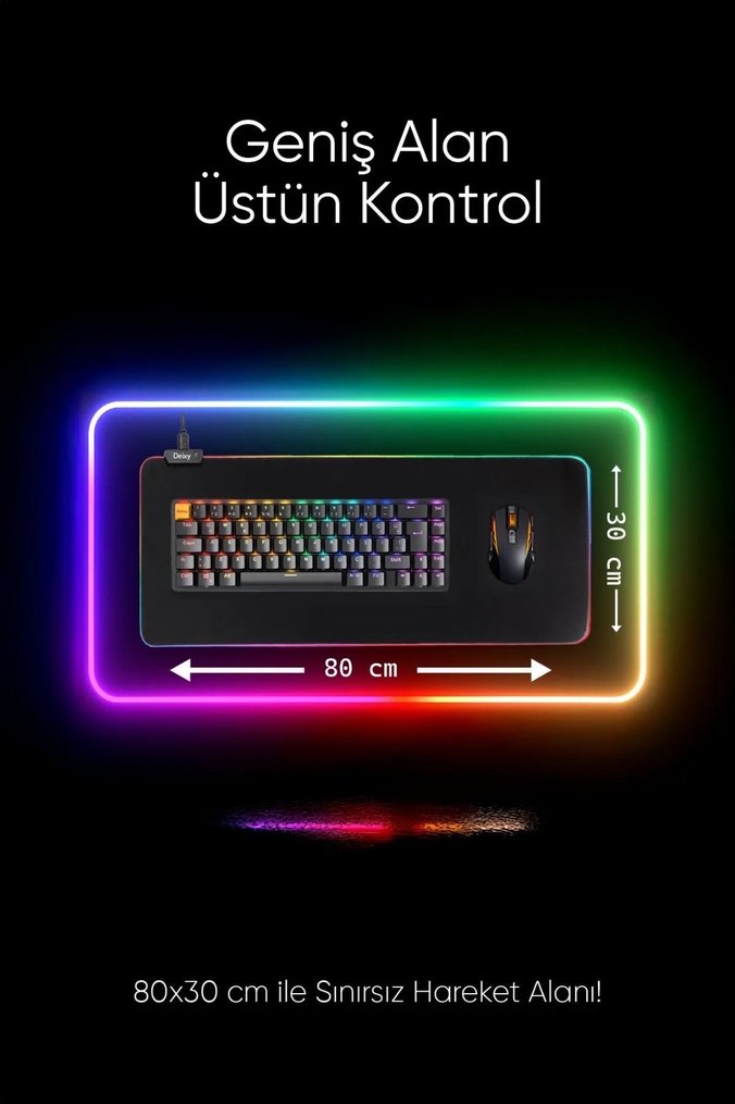 80x30 cm genişliğinde, RGB ışıklı çok renkli gaming mousepad, üstün kontrol ve sınırsız hareket alanı sunar. ️