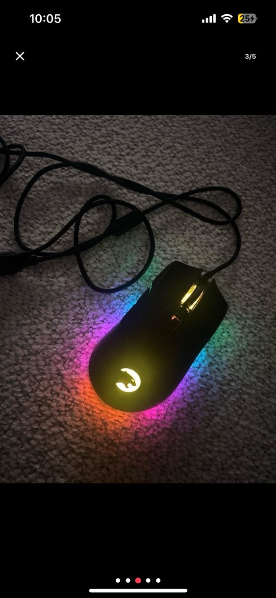 Kablolu, koyu renkli ve çok renkli RGB ışıklandırmalı bir mouse. Kenarlarında ve logosunda canlı renkler bulunur.