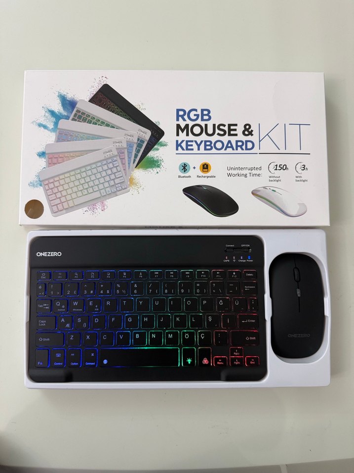 RGB ışıklı, çok renkli koyu klavye ve eşleşen mouse seti. Bluetooth bağlantılı, şarj edilebilir ve 150 saate kadar kesintisiz kullanım sağlar. Mouse 3 tuşludur.