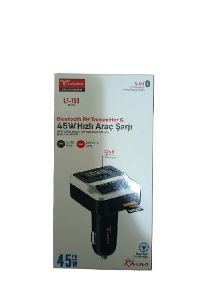 Rhino LF-153, 45W hızlı şarj ve Bluetooth FM verici özellikli, 5.4V çıkışlı, USB-C destekli gri-siyah araç şarj cihazıdır.