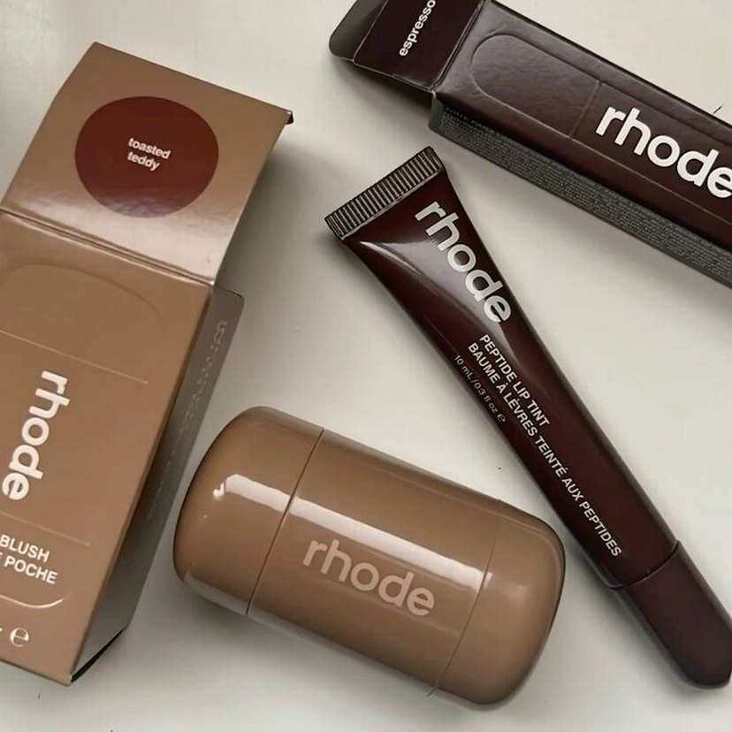 Rhode markasına ait koyu bej renkte dudak bakım seti, besleyici ve hafif renk veren dudak balsamı ile peptide lip tint içerir.