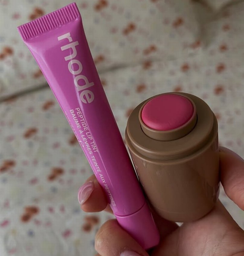 Rhode markasına ait pastel pembe dudak bakım seti, tonlu dudak balsamı ve peptit lip tint içerir, dudakları yumuşak ve besler.
