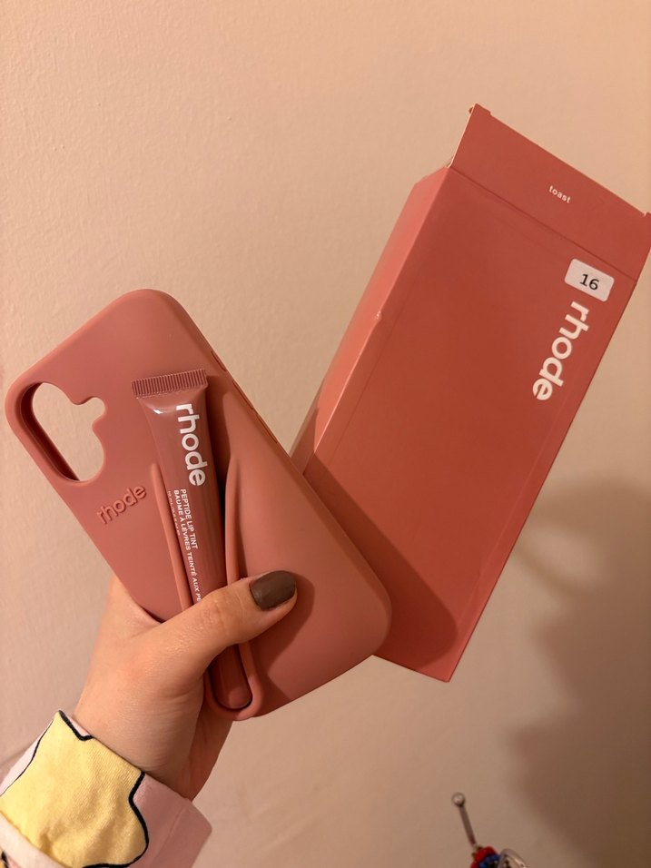 Camel renkli, parlak yüzeyli ve sade normcore tarzında telefon kılıfı. Üzerinde "rhode" yazısı bulunur ve yumuşak pastel görünüm sunar.