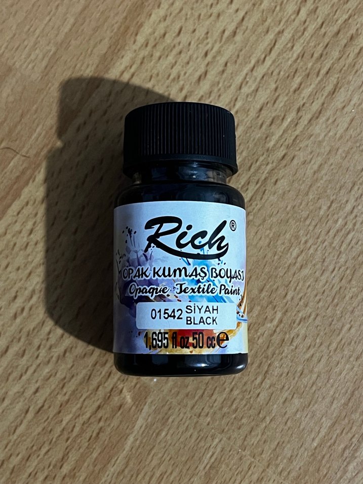 Rich marka, 50 ml siyah opak kumaş boyası. Kumaşlarda yoğun ve derin renk kapatıcılığı sağlar. Ürün biraz kullanıldı gayet başarılıdır. pazarlık payı vardır.