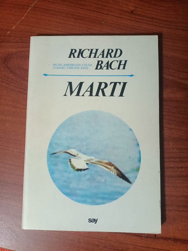 Richard Bach'ın 'Martı' adlı kitabı, özgürlük ve uçuşu simgeleyen martı görseliyle sade bir kapak tasarımına sahip.