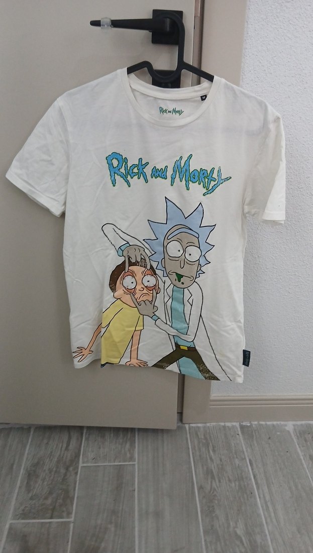 Pamuklu, kısa kollu, yuvarlak yaka, bol kesim beyaz tişörtü. Üzerinde renkli Rick and Morty baskısı bulunur.