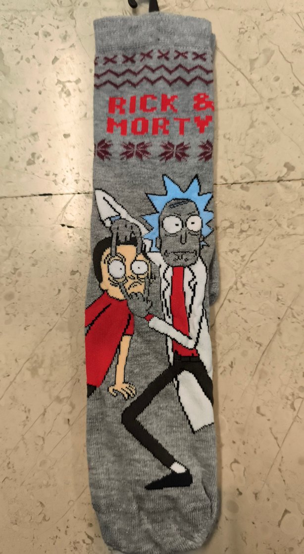 Gri renkte, Rick ve Morty karakterleri baskılı erkek çorabı. Üzerinde "RICK & MORTY" yazısı bulunur. Rahat ve günlük kullanım için uygundur.