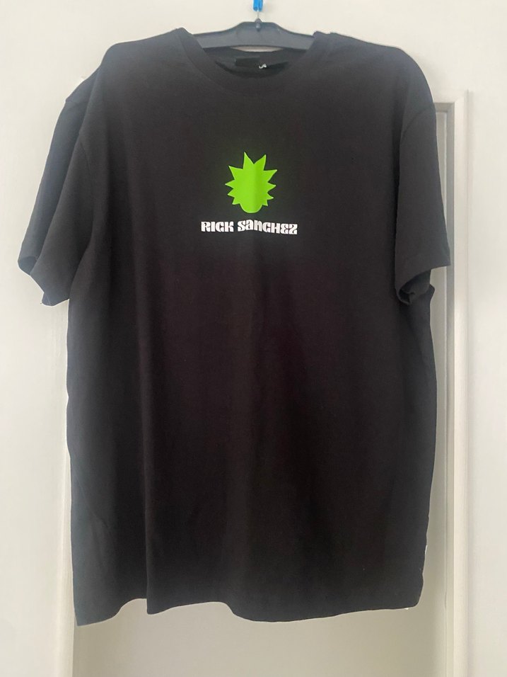 Önü koyu yeşil Rick Sanchez baskılı, oversize kesim siyah tişört. Yuvarlak yaka ve kısa kolludur, rahat sokak stili için uygundur.