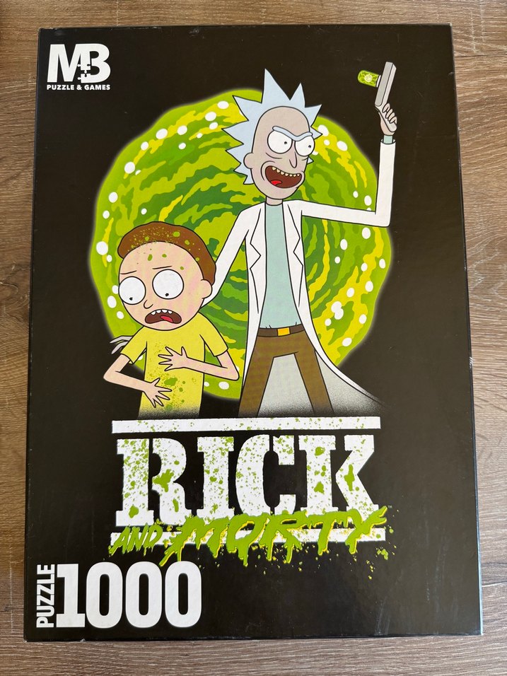 Rick ve Morty karakterlerinin yer aldığı, yeşil portal arka planlı 1000 parçalık puzzle. Koyu renkli, detaylı çizgi roman tarzında.