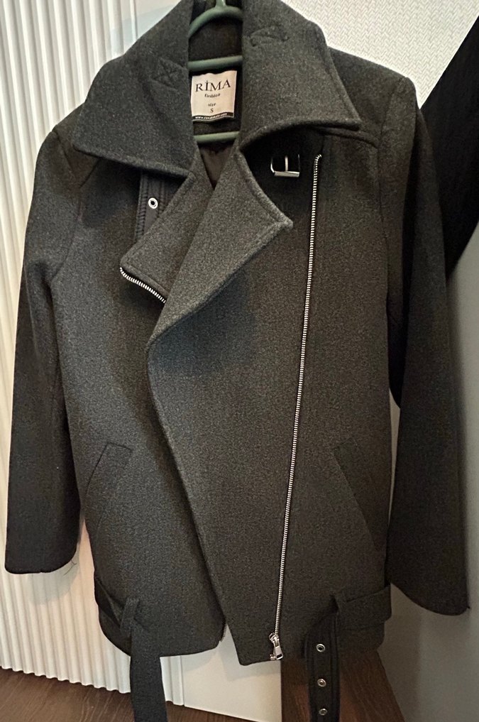 Siyah yün kaban, notched yaka ve tokalı detaylarla günlük sokak stili için uygun. Strappy kollu, midi boy ve desenizdir. "RIMA" etiketi bulunur.