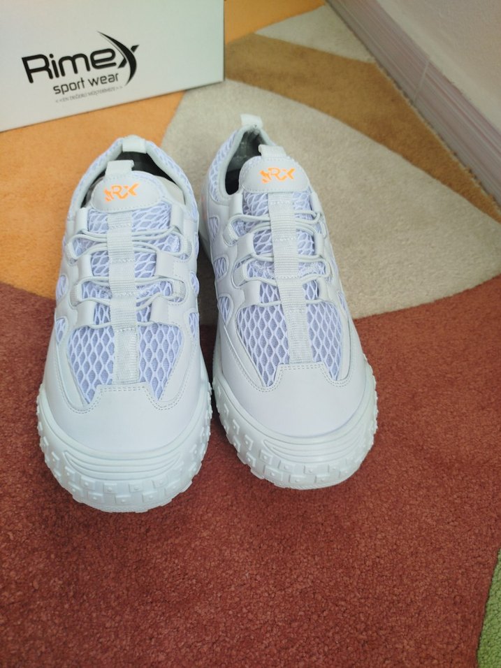 Rimex marka beyaz spor ayakkabı, blok topuk ve fırfır detaylarına sahip, kauçuk tabanlıdır. Trendy günlük kombinlere uygundur.