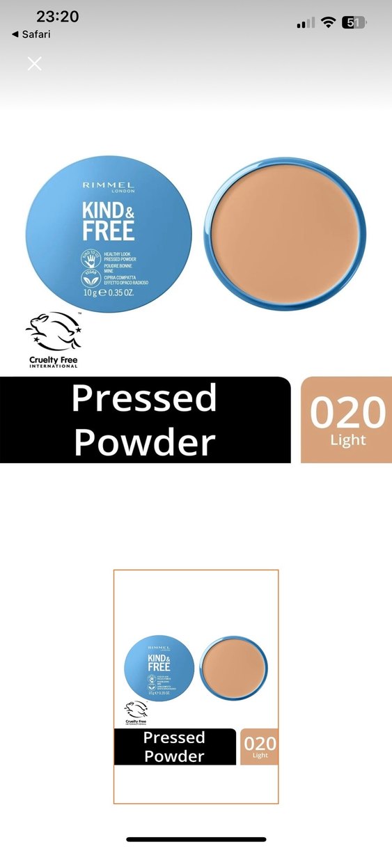 Rimmel Kind & Free 020 Light tonunda, doğal bej renkli preslenmiş pudra. Sağlıklı görünüm sağlar ve hayvanlar üzerinde test edilmemiştir. 10g ürün içerir.