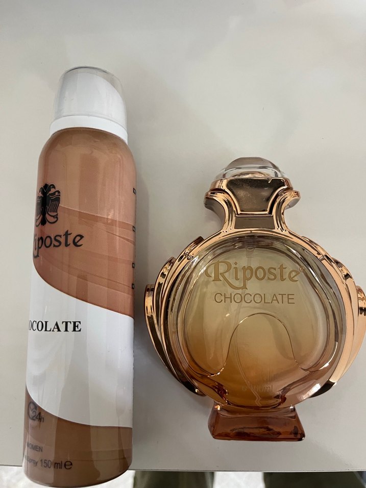 Riposte Chocolate kadın parfüm seti, sprey şişe ve özel tasarımlı cam parfüm şişesinden oluşur. Kokusu çikolata notaları içerir.