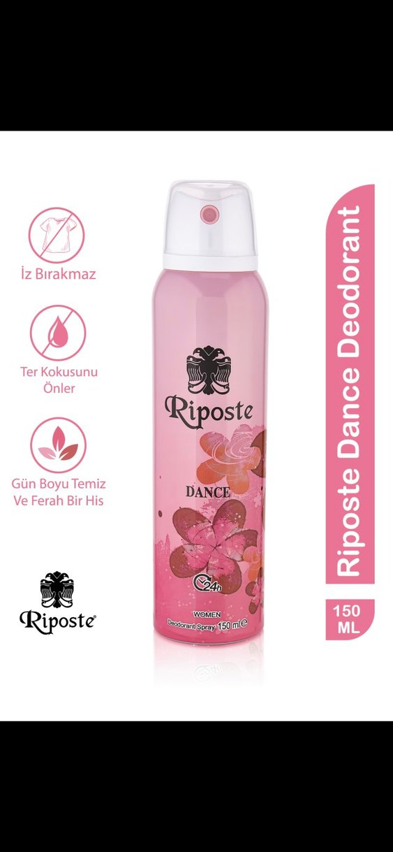 Riposte Dance deodorant ter kokusunu önler ve iz bırakmaz. Gün boyu temiz ve ferah bir his sağlar. 150 ml.