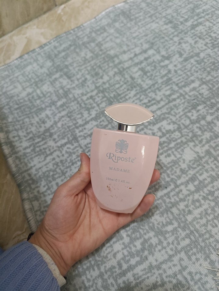 Riposte Madame, 150 ml kapasiteli kadın parfümü, yumuşak pembe şişe ve şık gümüş kapak ile sadece birkaç kere kullandım çiçeksiz bir koku tam değil biraz şekerli bir koku Ama güzel bir kokusu var ve kalıcı yayılımcı.