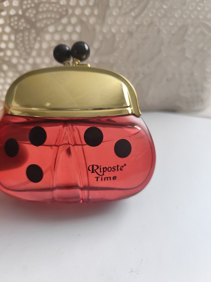 Kırmızı şişede siyah noktalar ve altın kapaklı Riposte Time kadın parfümü, uğur böceği şeklinde tasarlanmıştır. Zarafet ve çekicilik sunar.