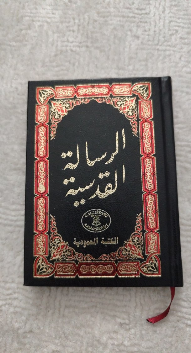 Kara kapaklı, kırmızı ve altın süslemeli Arapça yazılı dini kitap. cep boy