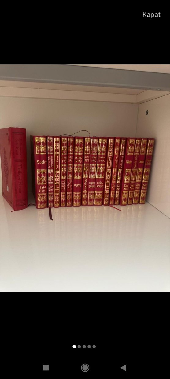 Said Nursi'nin kırmızı ciltli dini kitap seti, altın kabartma yazılar ve ayracı ile çok sayıda ciltten oluşur.