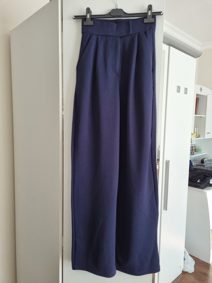 Ritnice marka lacivert palazzo pantolon. • Beden: 36 • Yüksek bel, bol paça • Likralı ve esnek kumaş • %60 polyester, %30 elastan, %10 lycra • Arkadan fermuarlı • Made in Turkey Ofis kombinleri ve şık günlük kullanım için uygundur. Dökümlü yapısı sayesinde vücut hatlarını güzel gösterir.