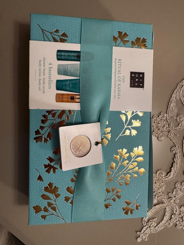 Ritual of Karma bakım seti, vücut, yüz ve ruh bakımı için 4 adet en çok satan ürünü içerir. Turkuaz kutuda, altın yaprak detaylı.
