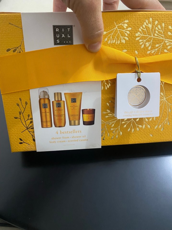 Rituals markasının Ritual of Mehr bakım seti, vücudu besleyen ve yumuşatan en çok satan 4 ürünü içerir. Sarı kutuda, altın detaylı.