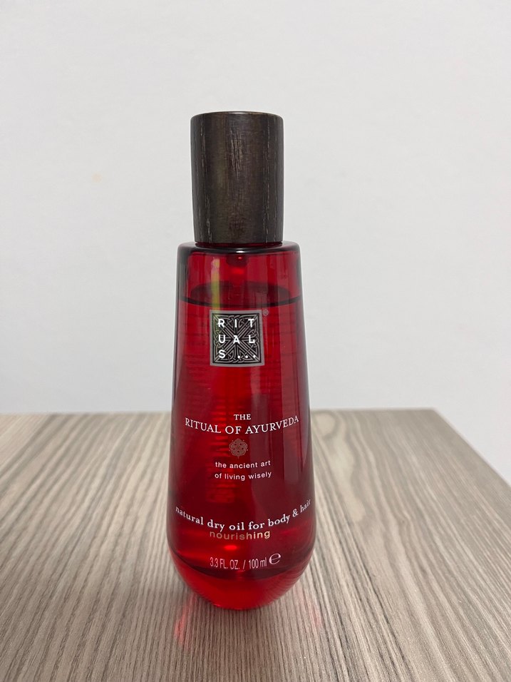 Rituals Ayurveda doğal kuru yağ, vücut ve saç için besleyici formüle sahiptir. Şişe 100 ml içerir. Göründüğü kadar kullanıldı. Kapağı çıkarırken sprey kafası içinde kalıyor nedense tam kapatmamayı öneririm.