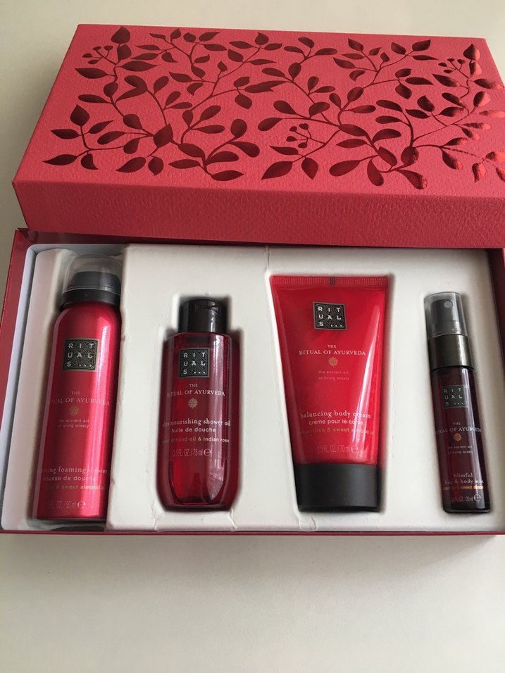 Rituals markasına ait erkek cilt bakım seti, köpüren duş jeli, besleyici duş yağı, temizleyici vücut kremi ve vücut spreyi içerir.
