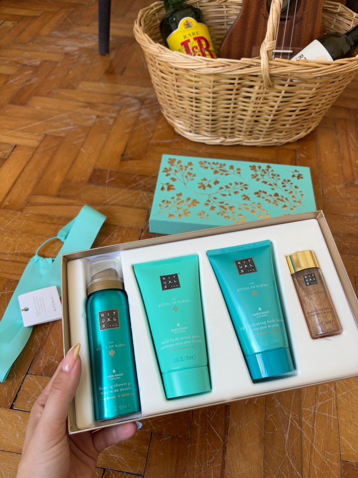 Rituals Of Karma vücut bakım seti, köpüren duş jeli, vücut peelingi, vücut kremi ve küçük yağ şişesi içerir. Hiç kullanılmadı
