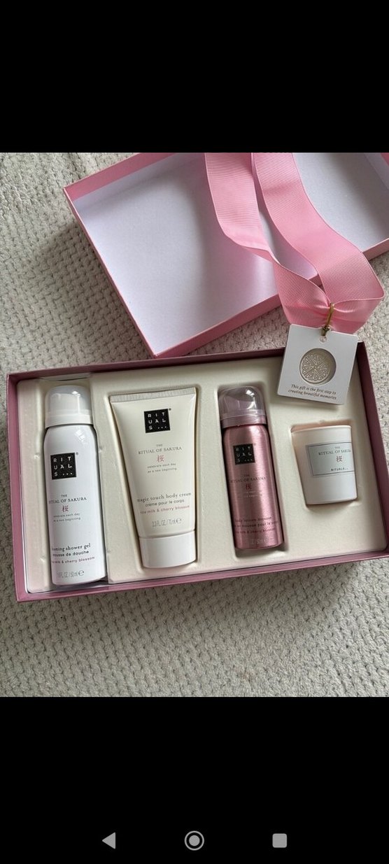 Rituals Sakura seti, köpüren duş jeli, zengin vücut kremi, vücut spreyi ve kokulu mum içerir, cildinizi besler ve şımartır.