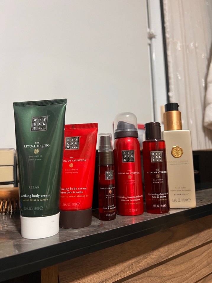 Rituals marka almanyadan alındı. Kırmızısı set sadece body mist %50 dolu ve el kremi görünüyor %70 dolu en az. Yeşil Relax el kremi %80 doludur çok az kullandım. Diğer büyük şişe Jasmin de %80 e yakın dolu. Duş köpüğü ve duş yağı hiç kullanılmadı.