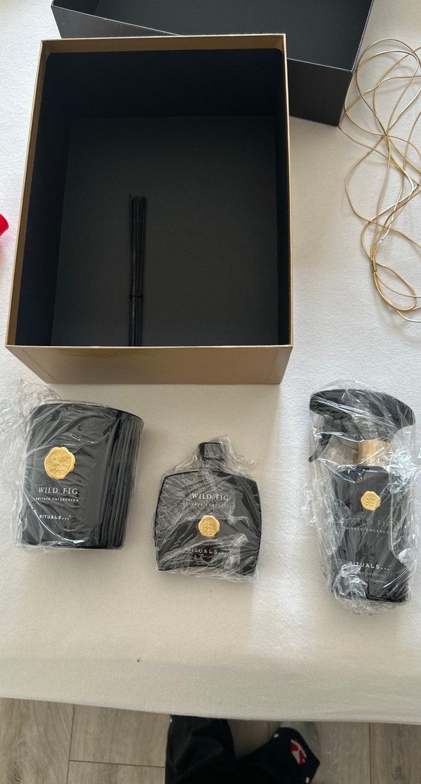 Rituals Wild Fig seti, siyah şık ambalajda mum, parfüm şişesi ve sprey içerir, koku severler için ideal. ️