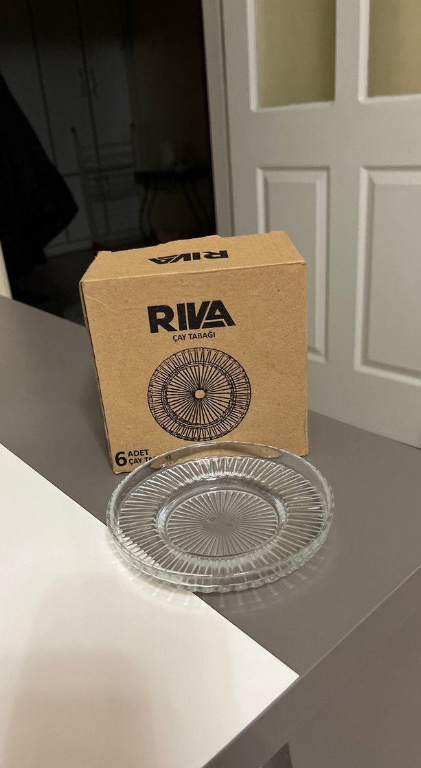 RIVA markalı, baskılı radyal desene sahip bej renkli cam çay tabaklarından oluşan 6'lı settir. Hafif, karşı kültür tarzındadır. ☕